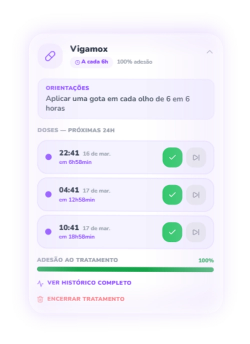 Carteirinha digital de vacinas, consultas, exames, medicamentos e registros com alertas inteligentes.